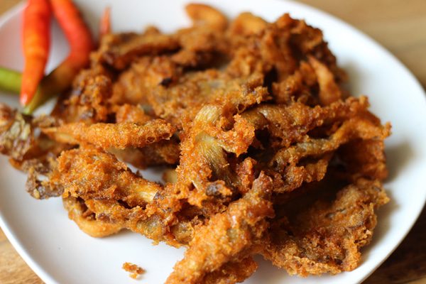Oyster mushroom was shredded and tossed in soy sauce, chicken stock powder, coriander roots, garlic and white pepper. Then it was coated with tempura flour and fried until golden brown.