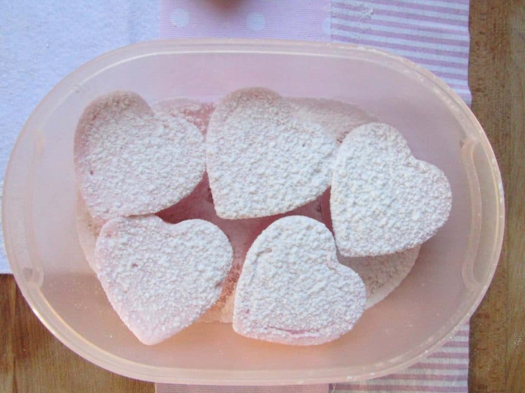 Dust all sides with icing sugar to remove all stickiness. If you’re not giving them straight away, keep them in the fridge in a plastic box. Dust the bottom of the box with icing sugar before placing the marshmallow hearts in it