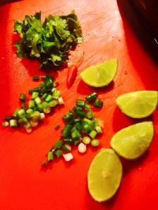 STEP 6 – Chop up some spring onion, coriander, lime and chilli (leave the chilli out if you do not like HOT).