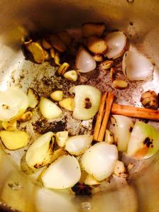 STEP 2 – Chop a brown onion into quarters and about 6 – 8 cloves of garlic (chop in half) and dry roast (no oil) until they start to brown/burn slightly. This helps enhance the flavours of the broth later on. Make sure to keep stirring. Then add your 2 cinnamon sticks, 5 star anise and a good knob of ginger to the pot and stir. Let these dry roast for about 5 more minutes.