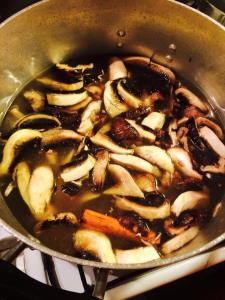 STEP 3 – Slice up your mushrooms ready to be added. The dry roasting should look a little like the below picture. Now add your 3L of veggie stock, mushrooms and about 3 TBS of braggs to the pot and stir. The mushrooms will further bring out a lovely flavour to the broth.